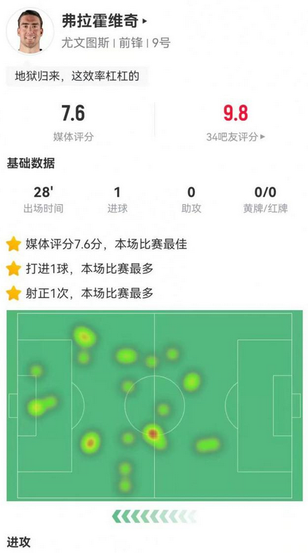 足彩推荐和买法DV9本场数据:替补28分钟2射进1球 11对抗6成功 获评7.6分最高